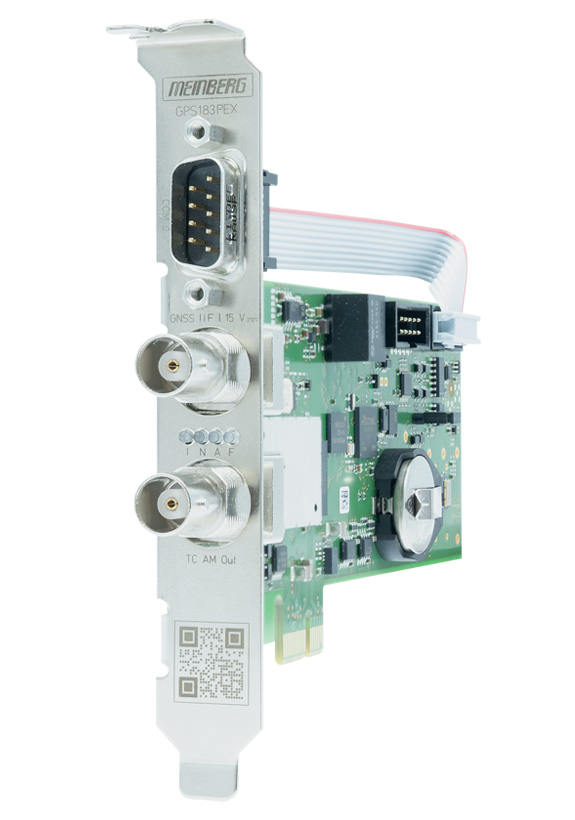 La tarjeta GPS183PEX ha sido diseñada como una tarjeta de perfil bajo para ordenadores con interfaz PCI Express. La cubierta trasera integra el conector de antena, un conector BNC para códigos de tiempo modulados, un conector macho de 9 pines SUB-D y dos LEDs de estado. Con el soporte de altura estándar se puede usar el conector SUB-D para E/S de señales como PPS y PPM por RS-232 y para actualizaciones de firmware.